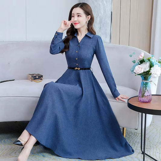 Elegant Female Casual Solid Cotton Linen Long Sleeve Maxi Dress 2024 Autumn Winter Vintage Shirt Dress Bodycon Party Prom Dress